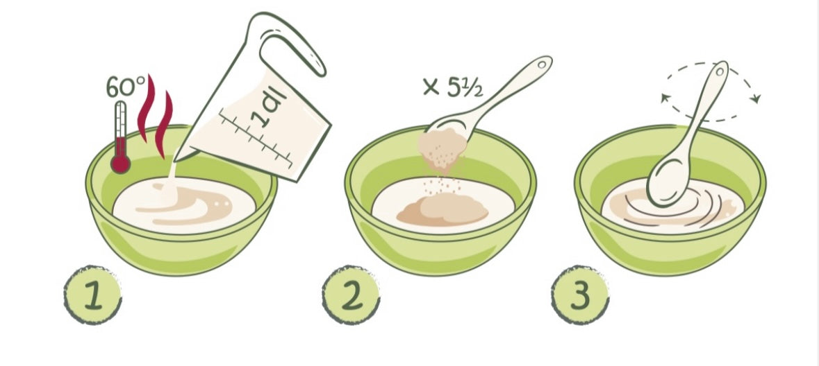 Opvarm 1 dl vand eller barnets sædvanlige mælk og bland det med 30 g. / 5,5 spsk. grødmix